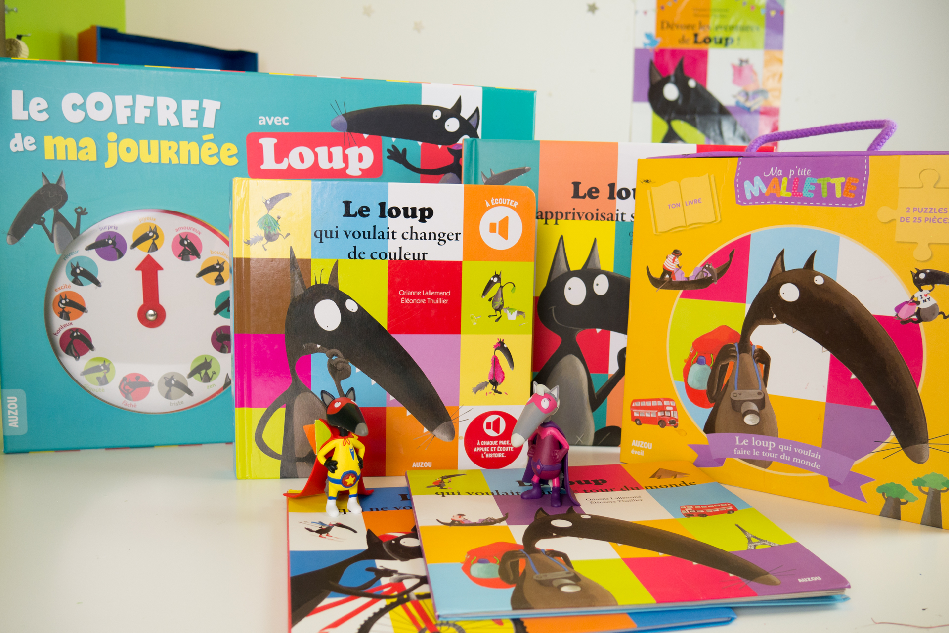 Pour aller plus loin et créer tes propres histoires , il existe aussi des figurines et des peluches trop sympa ! Il ne te reste plus qu’à choisir entre loup super héro, loup en pyjama, loup détective ……