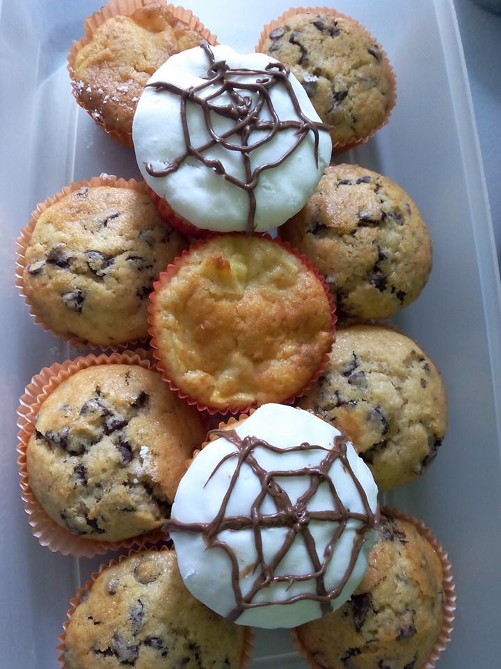 et les muffins toile d’araignée ( pour la recette des muffins c’est par ici. Tu peux mettre des pépites de chocolat à la place des pommes miam !!!)