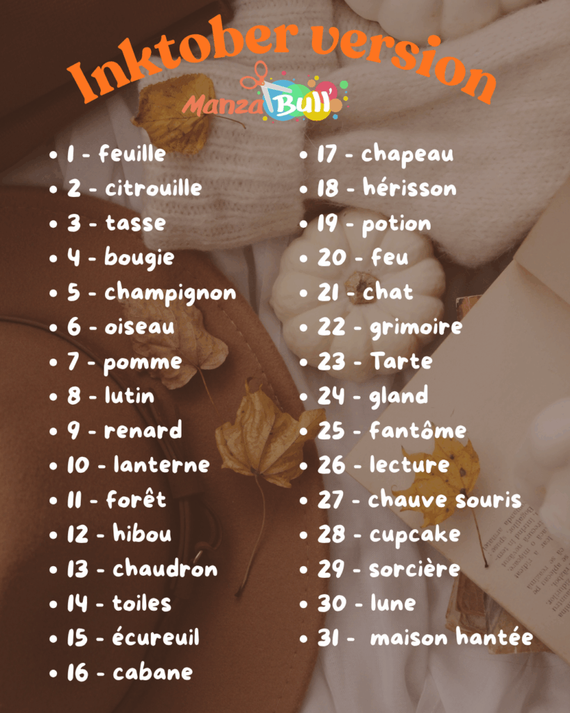 Je te propose de faire Inktober version Manzabull , un mot par jour en rapport avec l’automne cocooning et l’ambiance halloween qui t’inspirera pour la réalisation d’un dessin !